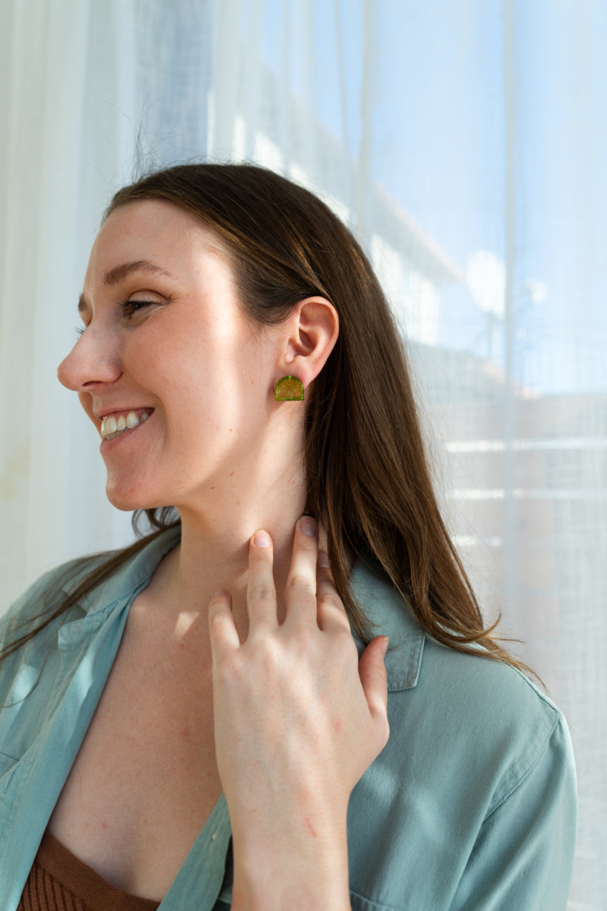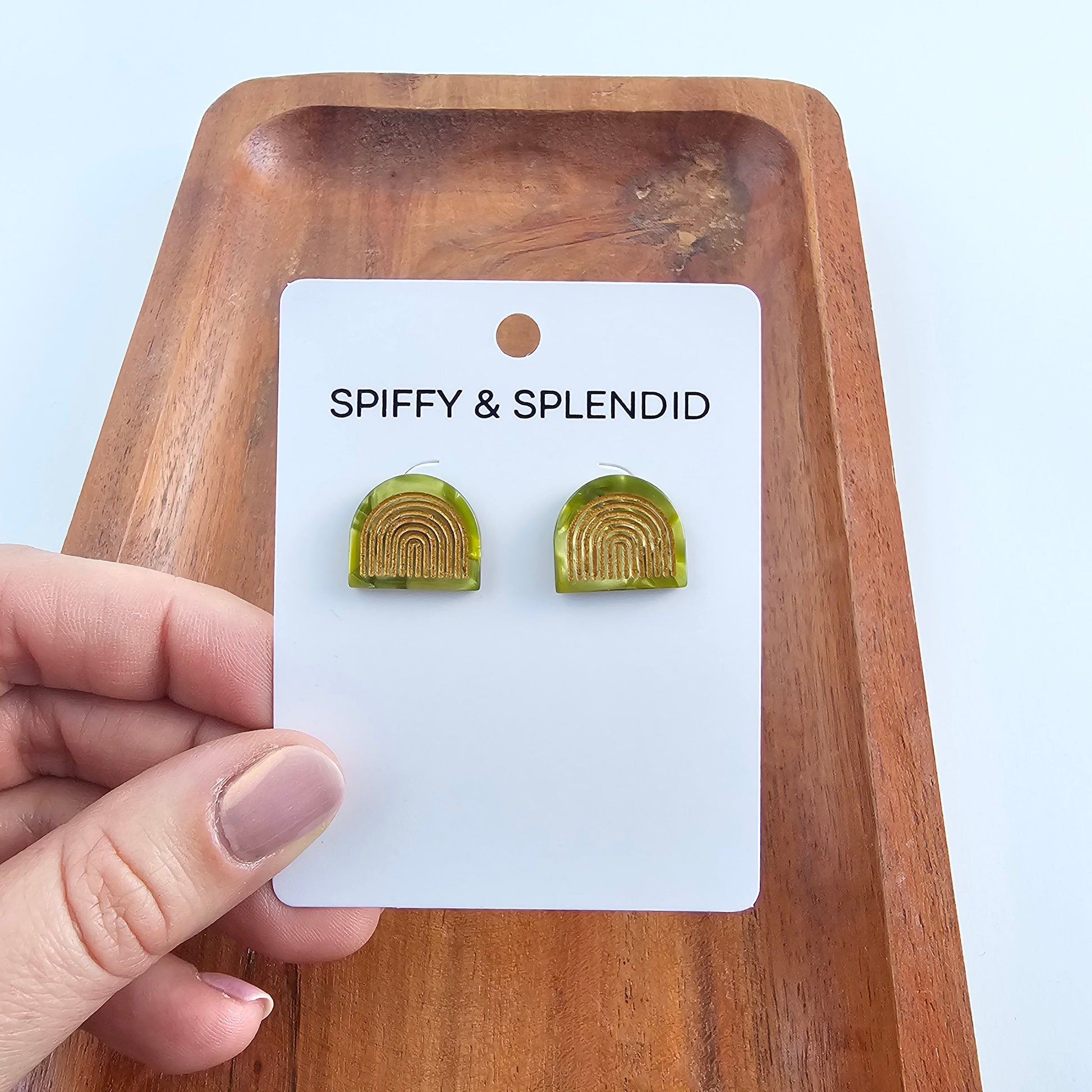 Get ready to dazzle with our Betty Studs! These Art Deco inspired acrylic stud earrings feature sleek gold arch accents for a touch of elegance. Lightweight yet striking, they are perfect for adding a vintage-inspired charm to your everyday outfits.