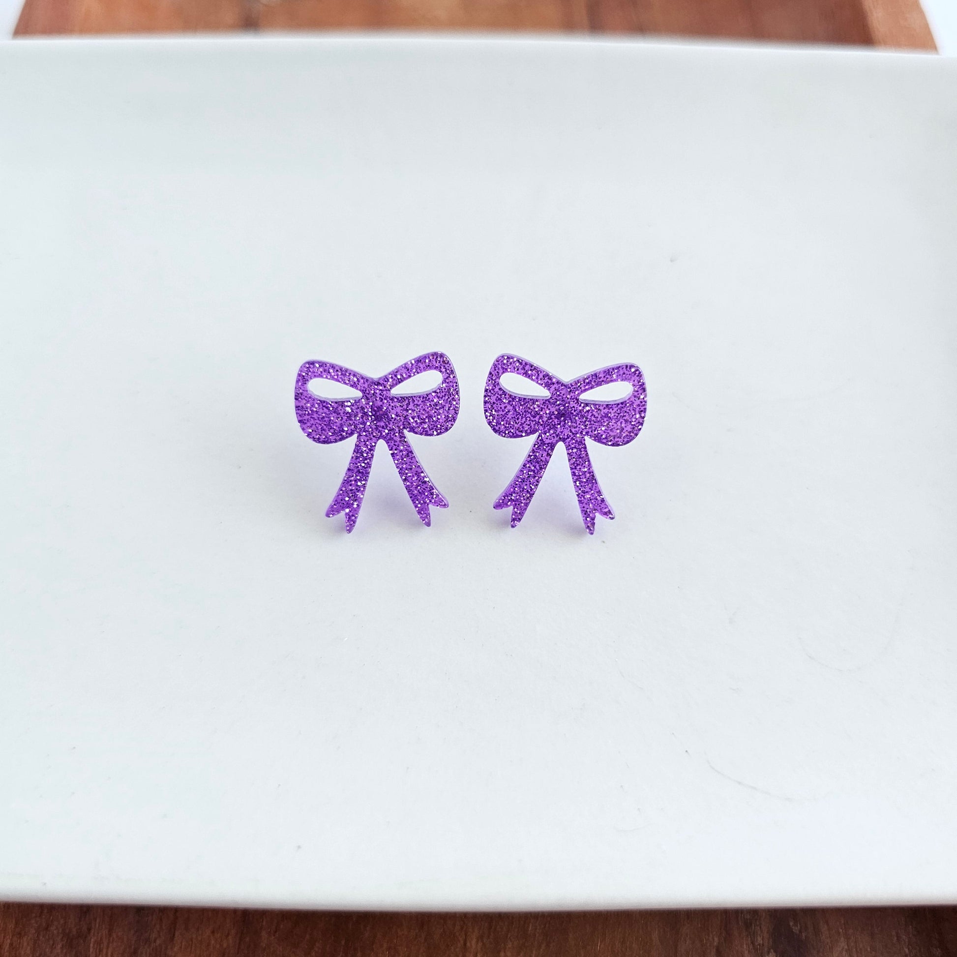 Get ready to add some sparkle and shine to your game day look! These glitter bow studs will make you stand out in the crowd and add some fun to your outfit. Perfect for showing off your team spirit in a unique and stylish way. You'll be the talk of the tailgate with these playful and on-trend earrings!