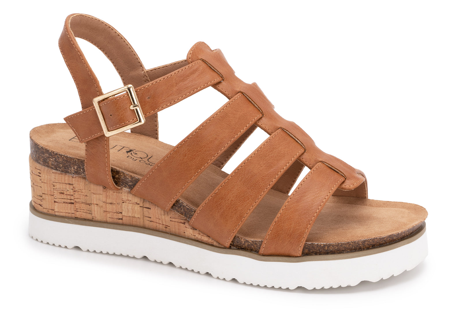 Adjustable Strap. 2 3/8” wedge heel. True to size. If you are a half size round up. This is wide foot friendly.