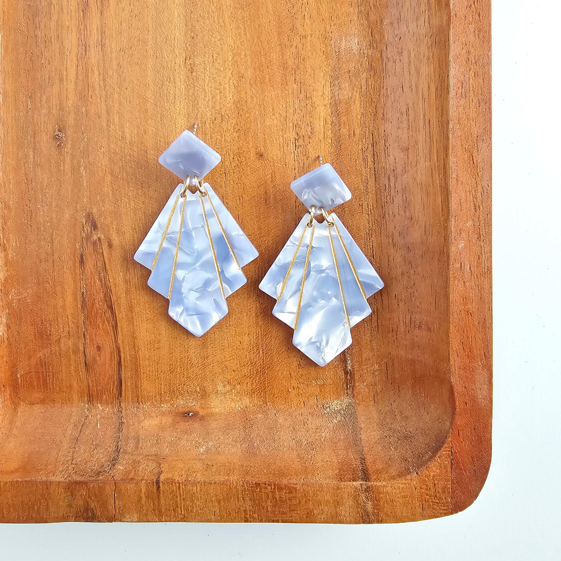 Get ready to make a statement with our Estelle Earrings in Glacier Blue! These art deco-inspired earrings feature stunning gold accents in a unique tiered diamond shape. Add a touch of elegance and playfulness to any outfit with these beauties.